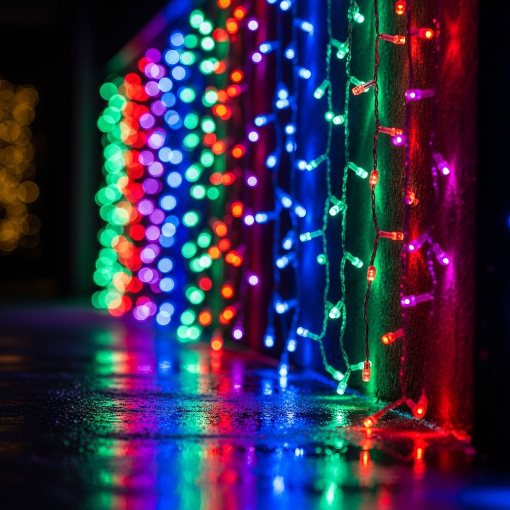 If you’re into big, bold displays, curtain lights are your go-to. Hang them on walls, fences, or behind windows for a full-on festive vibe.