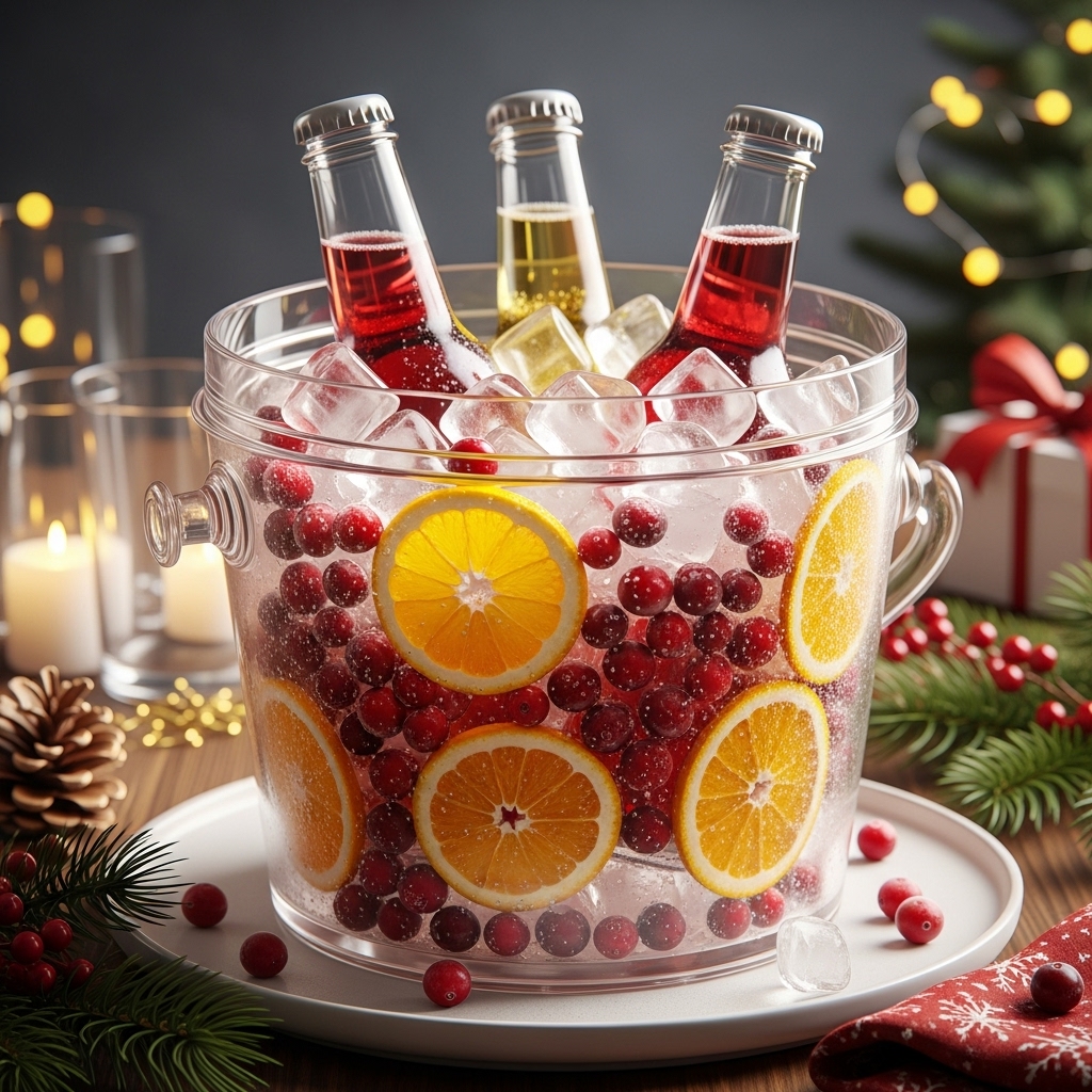 Okay, this might sound extra… because it is. But hear me out: an ice bucket filled with frozen cranberries and citrus slices instantly looks magical. Plus, it keeps bottles cold without watering things down.