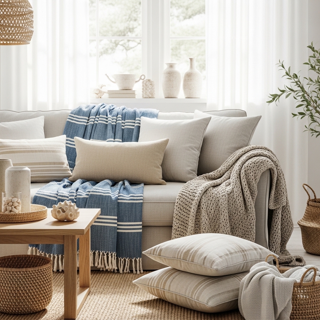 Small changes create big results. Swap a few pillows, add a natural rug, and suddenly your living room feels like a relaxed beach retreat.