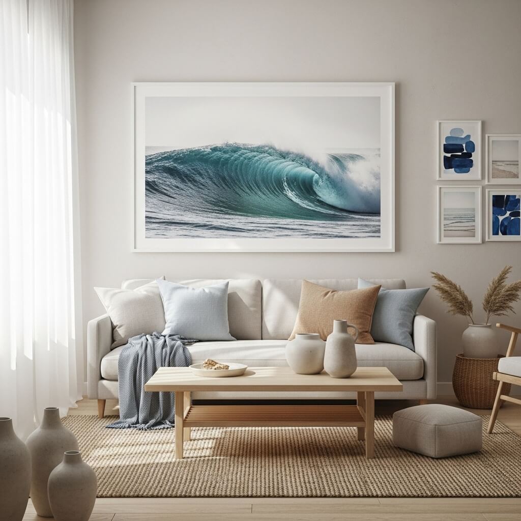 Bare walls make a coastal room feel unfinished. You want artwork that subtly reminds you of the ocean.