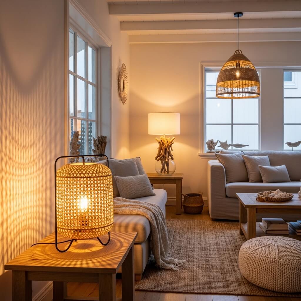 Lighting changes the entire mood of a room. Coastal interiors look best with warm, soft lighting.