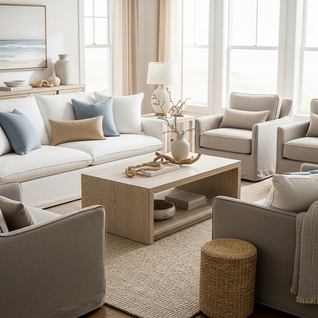 A coastal room always begins with the right colors. Think soft whites, sandy beige, ocean blues, and light gray tones.