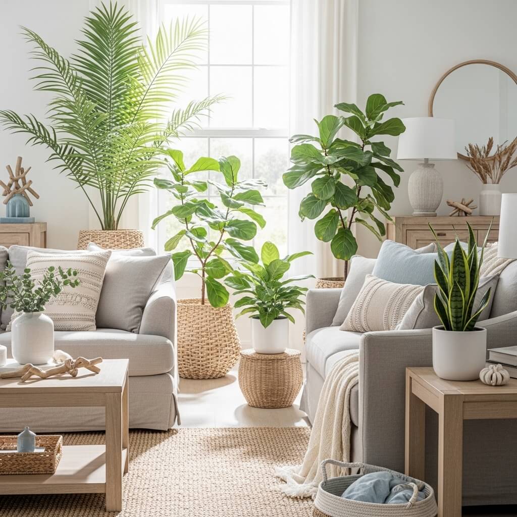 Plants instantly bring life into a living room. Coastal spaces look especially good with greenery.