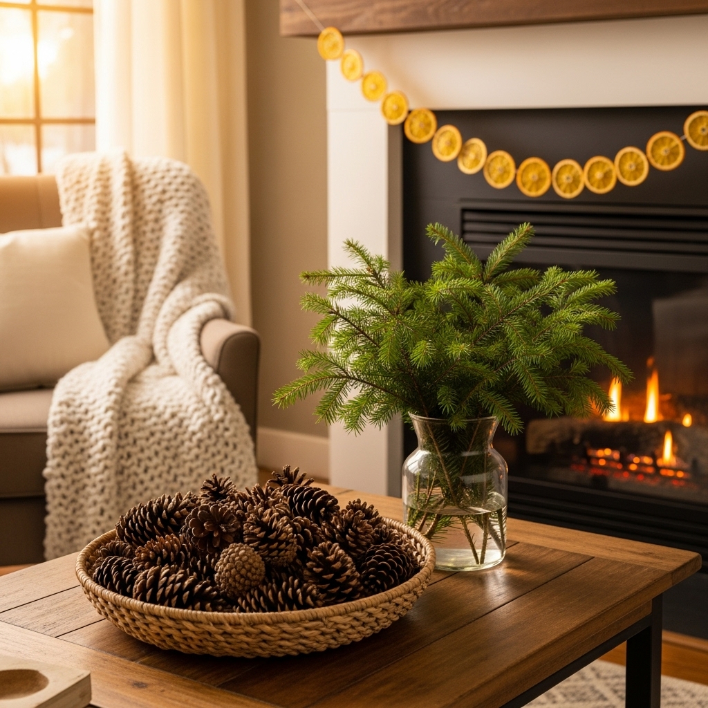 Candles are the easiest way to make your space feel warm, calm, and Christmassy. Group pillar candles or tea lights on a tray, mix in a few pinecones or ornaments, and boom—instant centerpiece.