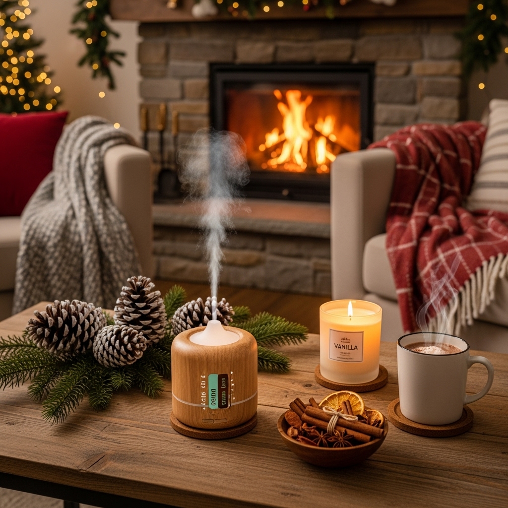 Simmer cinnamon sticks, cloves, and oranges on the stove or use essential oils like pine, cedarwood, or vanilla for that festive aroma.