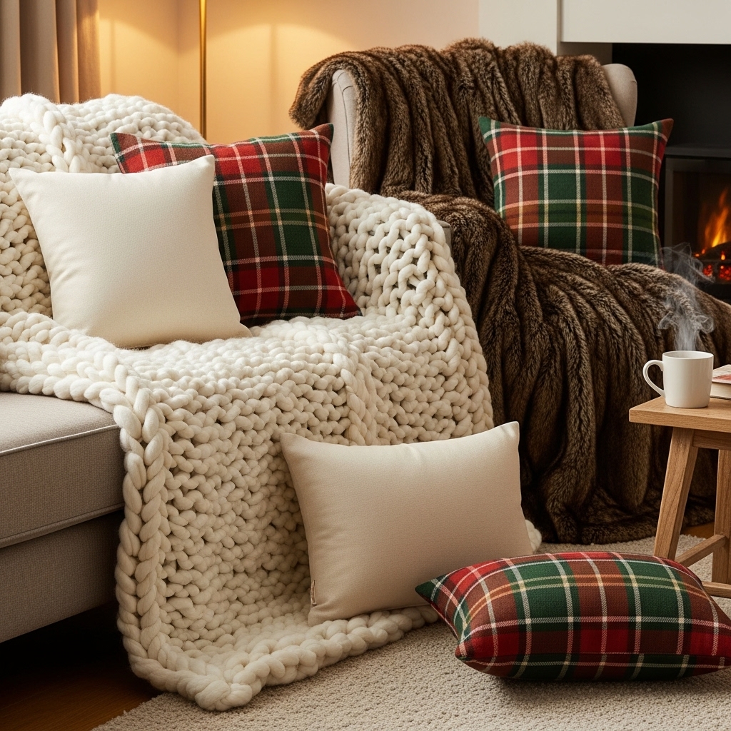 Pro tip: Mix textures. The blend of knit, velvet, and faux fur makes even the tiniest living room feel like a winter wonderland lodge.