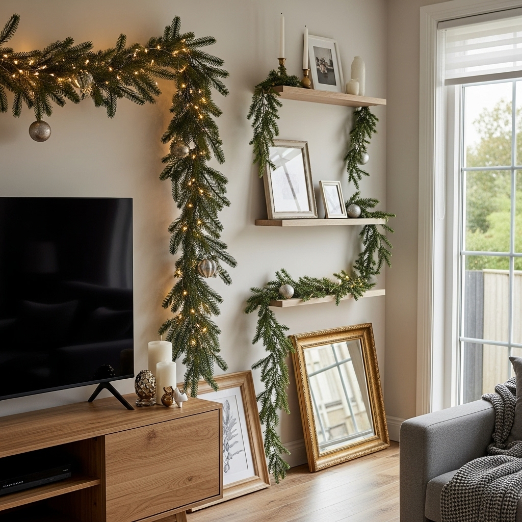 Add fairy lights or small ornaments for extra sparkle. If you’re short on time (or patience), go for a pre-lit artificial garland—because nobody wants to wrestle with tangled string lights in December.