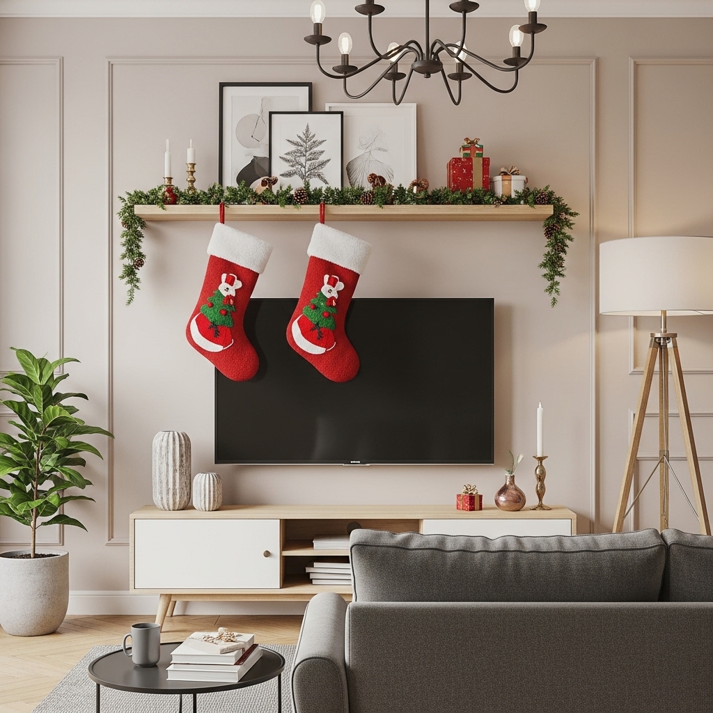Small living rooms thrive on smart corner use. If you can’t fit a tree, decorate your corners with tall floor vases filled with faux branches, fairy lights, or ornaments.