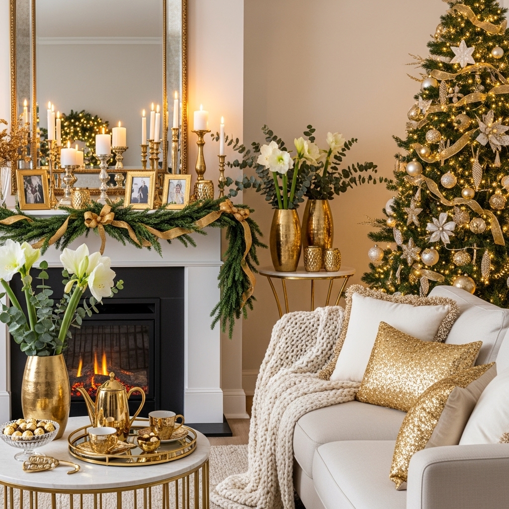 Metallics reflect light and make small spaces feel bigger. A few gold or silver accents—like candleholders, photo frames, or vases—can add instant holiday glam.