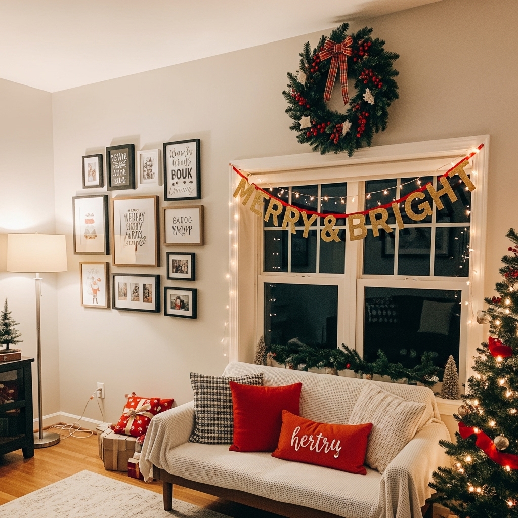 Stick to neutral tones with pops of red, green, or gold. Light colors keep the space open, while accents add festive charm.