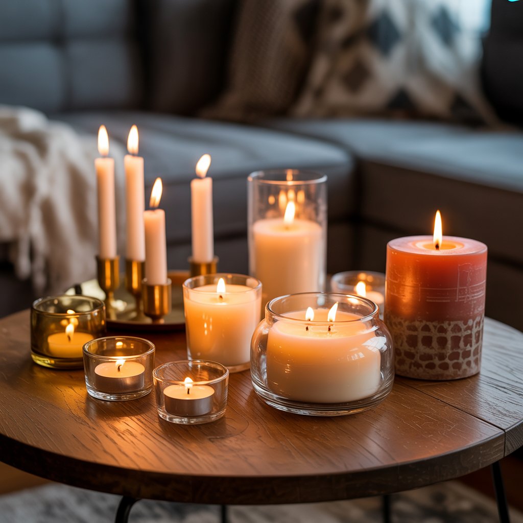 Mix different sizes and styles: taper candles for elegance, tealights for subtle glow, and big jar candles for that “I live in a lifestyle ad” feel.
