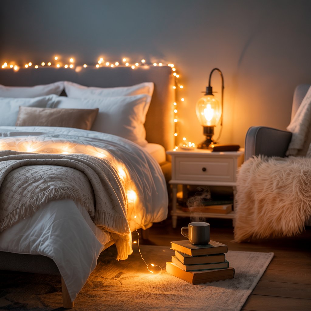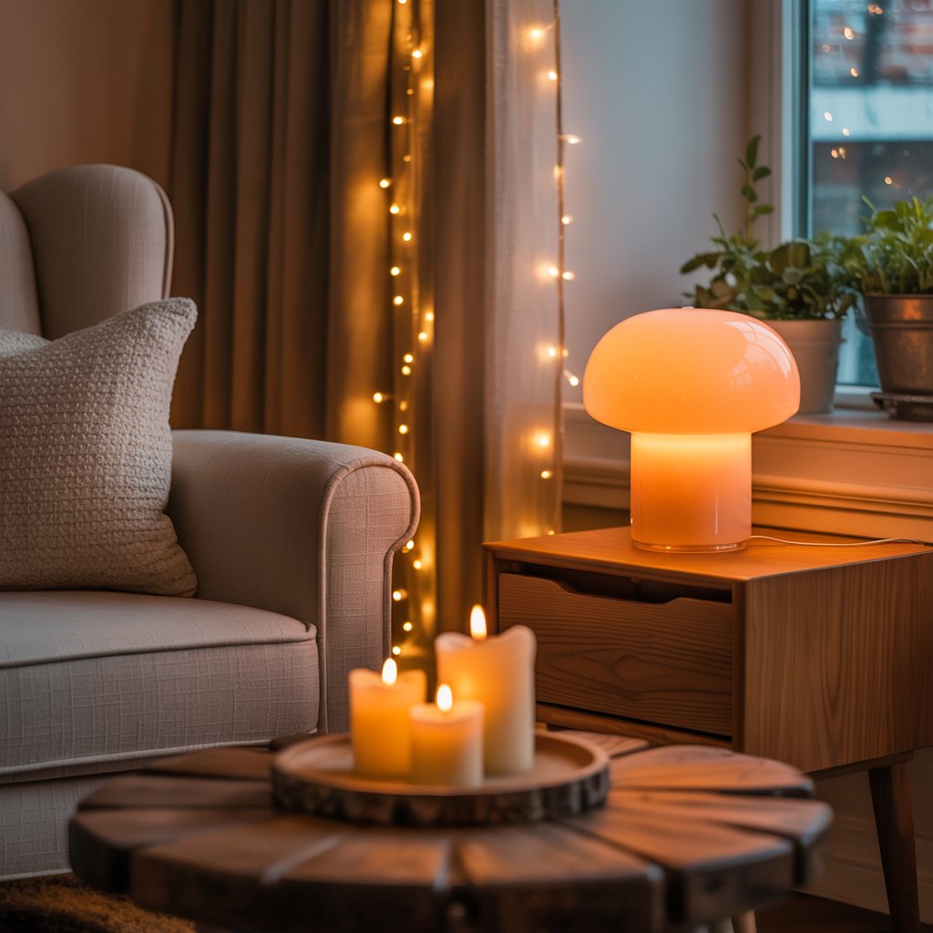 Use warm, golden lighting to make your home glow. Add table lamps, string lights, and candles for a layered lighting effect.
