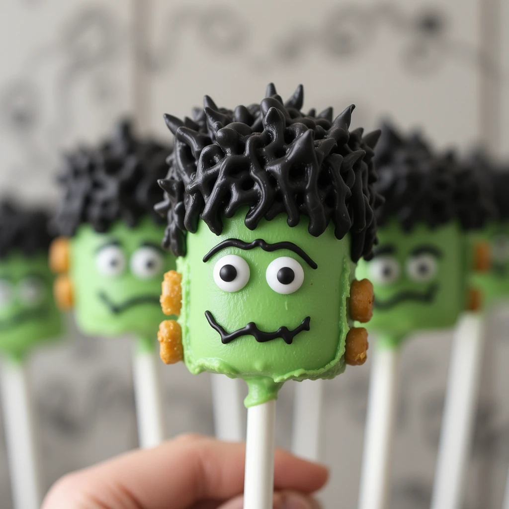 Dip marshmallows in green candy melts, stick on some pretzel “bolts,” and draw on a face with edible markers.