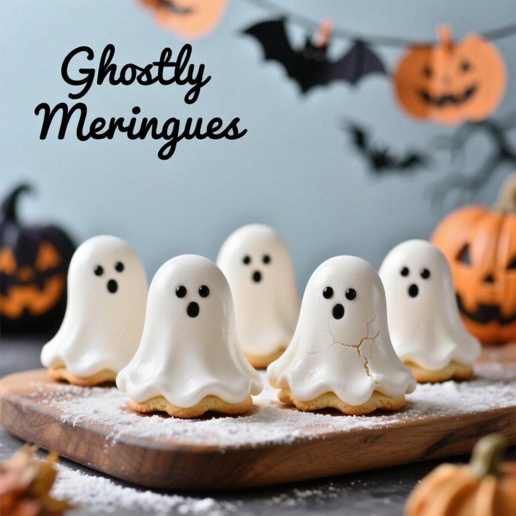 Pipe meringue into ghost shapes, bake, and stick on tiny eyes. These are crispy, melt-in-your-mouth, and way cuter than store-bought cookies.