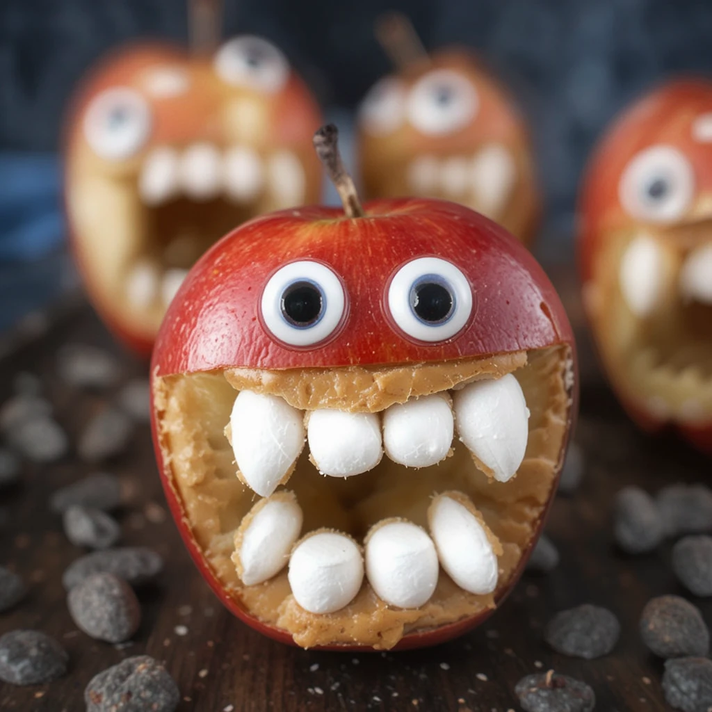 Slice apples, spread peanut butter, and stuff them with mini marshmallows for “teeth.” Add candy eyes, and suddenly your apple looks like it’s screaming.