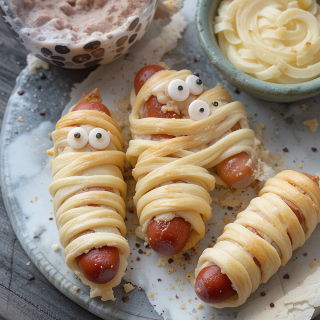 Ok, this one’s a classic. Wrap hot dogs in crescent roll dough, bake, and stick on candy eyes.