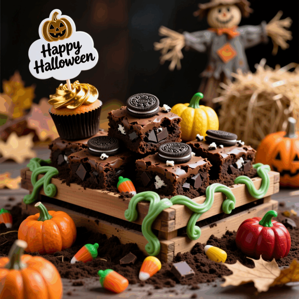 Top brownies with crushed Oreos (for “dirt”), candy pumpkins, and green frosting vines.