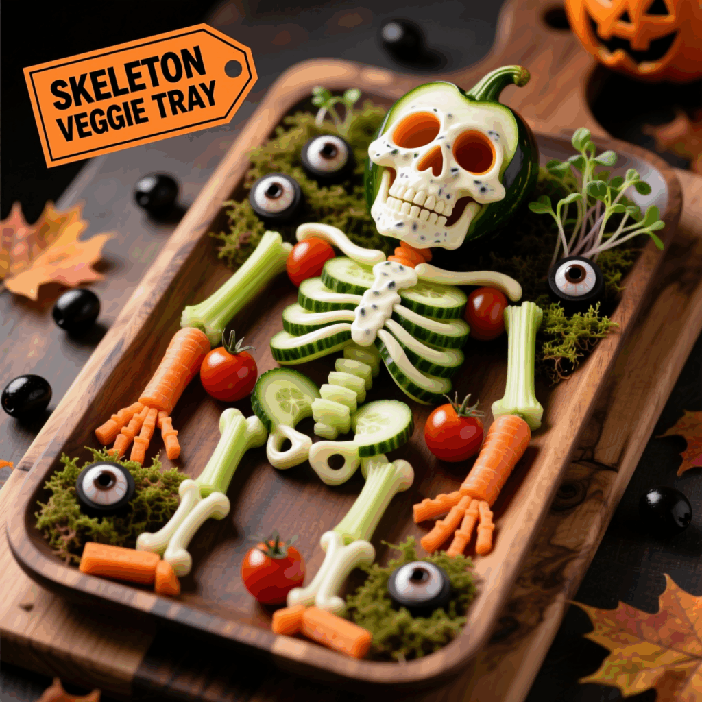 Not every Halloween treat has to be sugar-loaded. Arrange veggies into a skeleton shape with ranch dip as the “skull.”