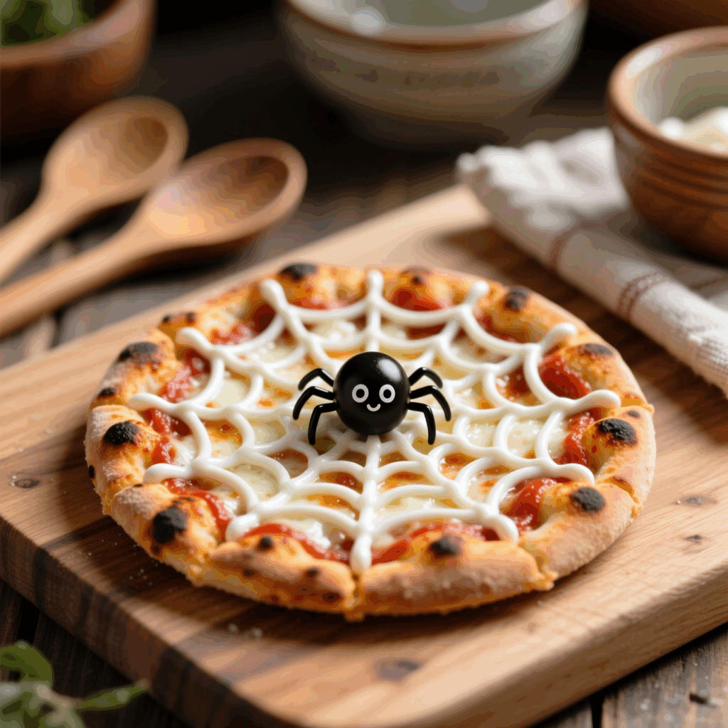 Make mini pizzas, then pipe cream cheese or ranch in a spiderweb pattern. Add a black olive “spider.”