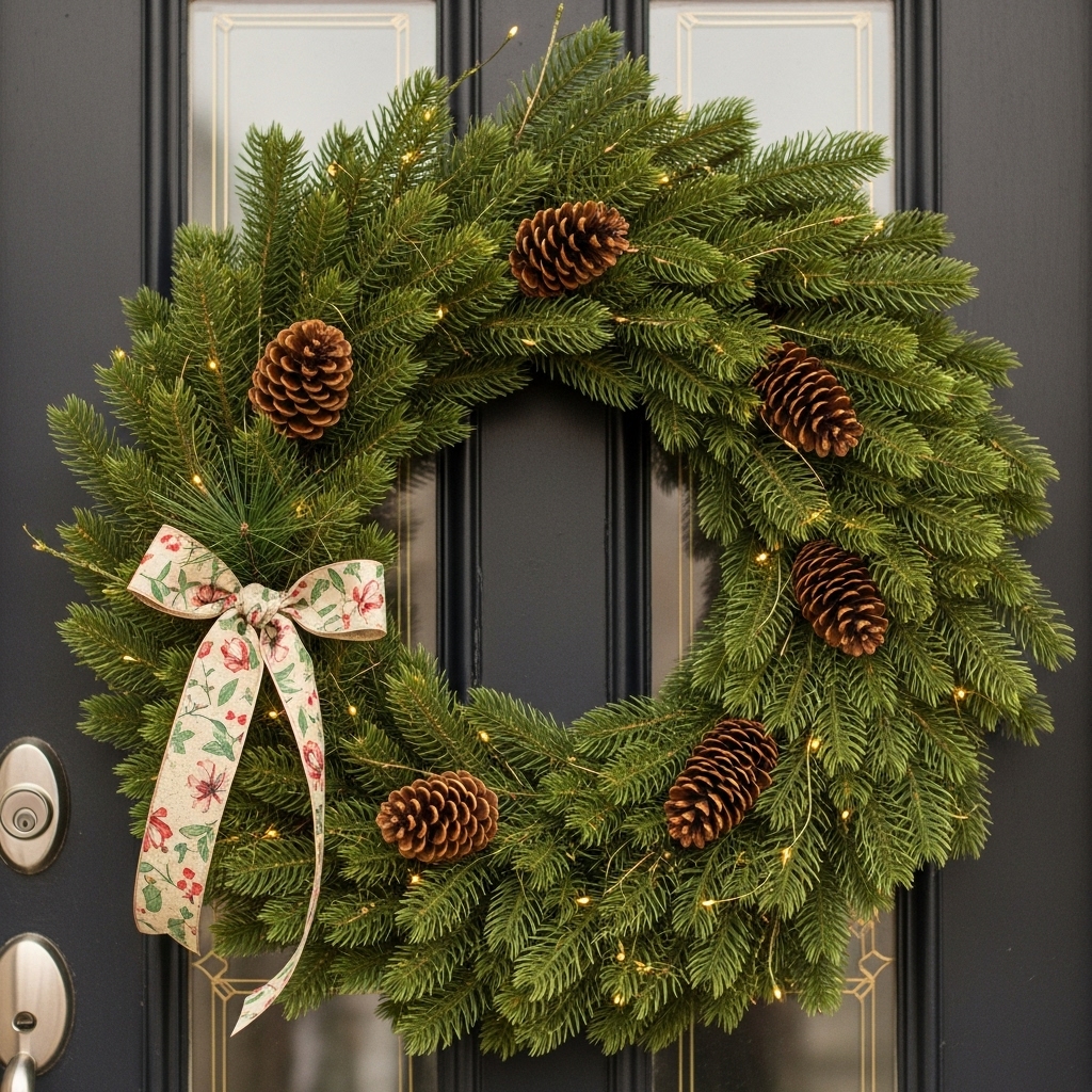 Sometimes the old-school approach just hits right. A classic evergreen wreath gives your entryway that warm, nostalgic vibe we all secretly love.