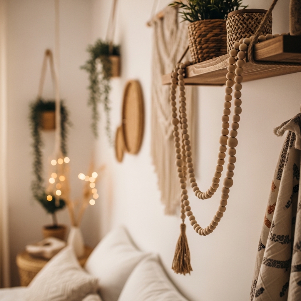 Beads add movement and softness. I draped mine over a shelf and they added a subtle boho touch. Boho bedroom wall décor shines when you layer small details, not just big pieces. Isn’t it the little stuff that makes a room feel finished?