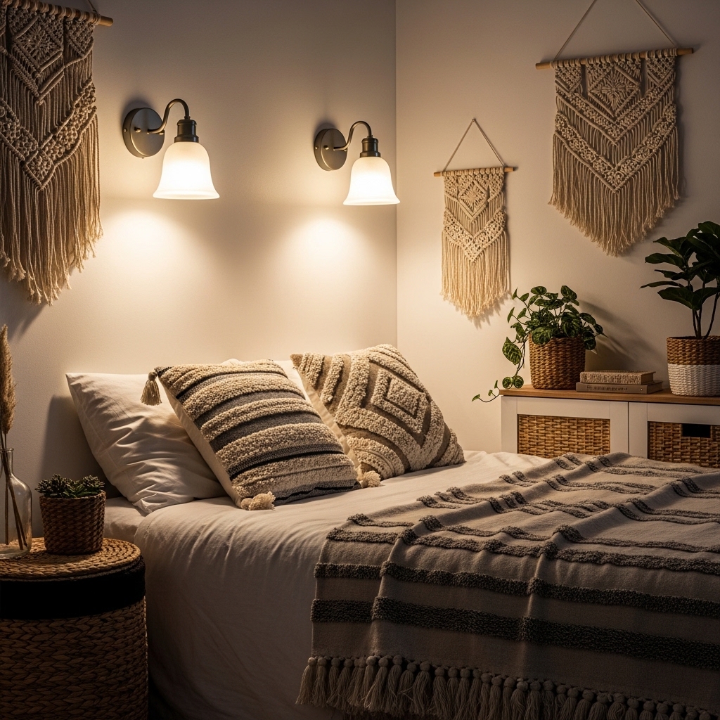 Lighting changes everything. I added boho wall sconces beside my bed and the room felt ten times cozier. Soft lighting always makes boho wall décor shine, especially at night. Who wants harsh overhead lights anyway?