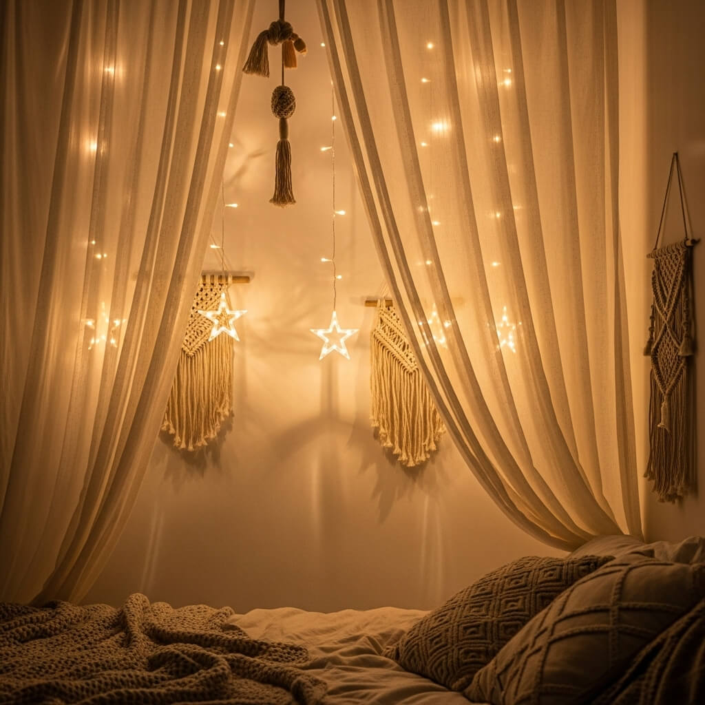 Fairy lights make everything feel magical. I hung them behind sheer curtains and now my room glows at night. Boho wall décor feels incomplete without soft lighting, and this adds instant romance. Who doesn’t love a cozy glow at bedtime :/