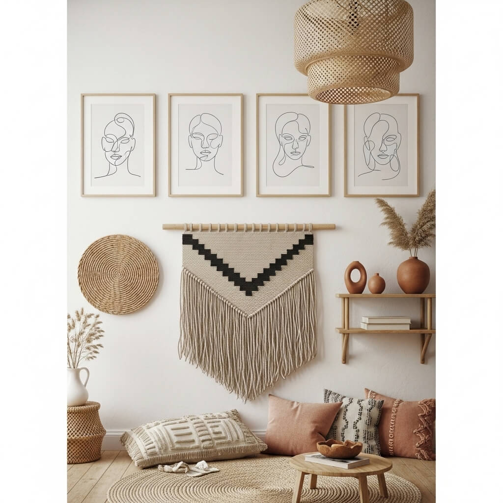 Line art balances busy boho textures. I hang mine near woven décor so the wall feels calm instead of cluttered. Dreamy boho wall décor needs balance, or things get messy fast. Don’t you hate when a wall feels chaotic?