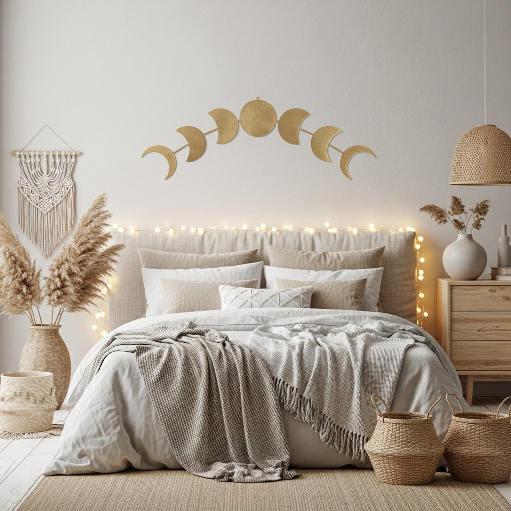 Moon phases bring that soft, mystical boho energy. I added one over my headboard and the whole room felt dreamy, almost like Pinterest but real. Boho bedroom wall décor thrives on subtle magic, and this delivers it. Who doesn’t love a little celestial vibe?