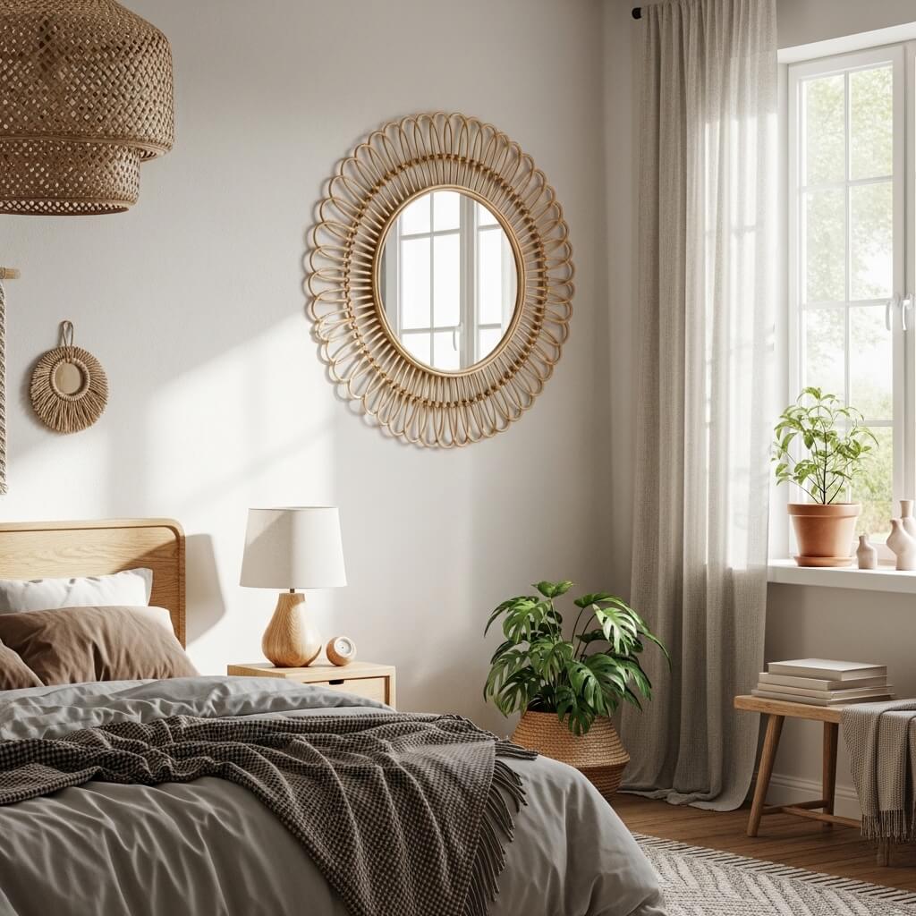 Every boho bedroom needs a statement mirror. I hung a rattan one near my window and the light instantly felt brighter. Boho wall mirrors bounce light and make small rooms feel bigger, which always feels like a win. Who doesn’t want a room that feels airy and open?
