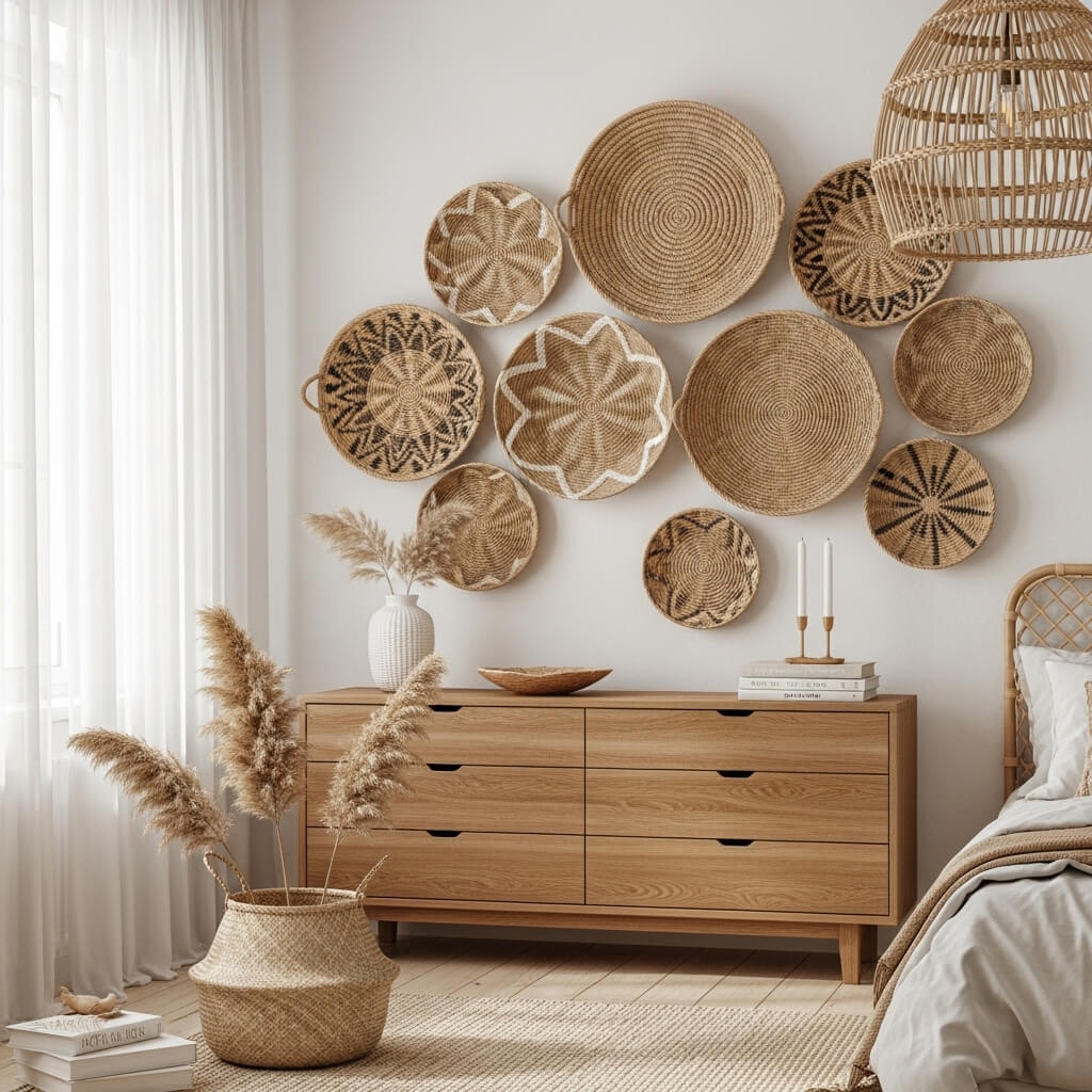 Woven baskets turn plain walls into art. I used three above my dresser and suddenly that wall felt styled instead of empty. Dreamy boho wall décor loves layers, and baskets add depth without clutter. Ever feel like one piece just looks lonely?