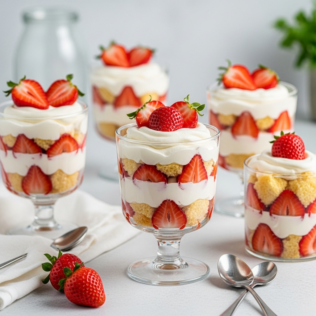 Layered desserts are my jam, literally. Fresh strawberries, whipped cream, and sponge cake in a glass. They look fancy, taste amazing, and you don’t even need a fork.