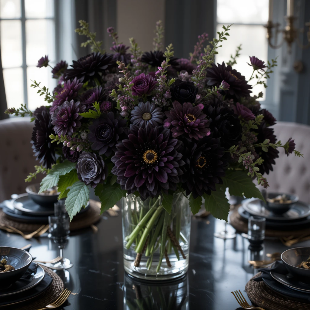 Who says flowers are just for spring? Embrace dark, moody florals like black dahlias or deep purple roses.