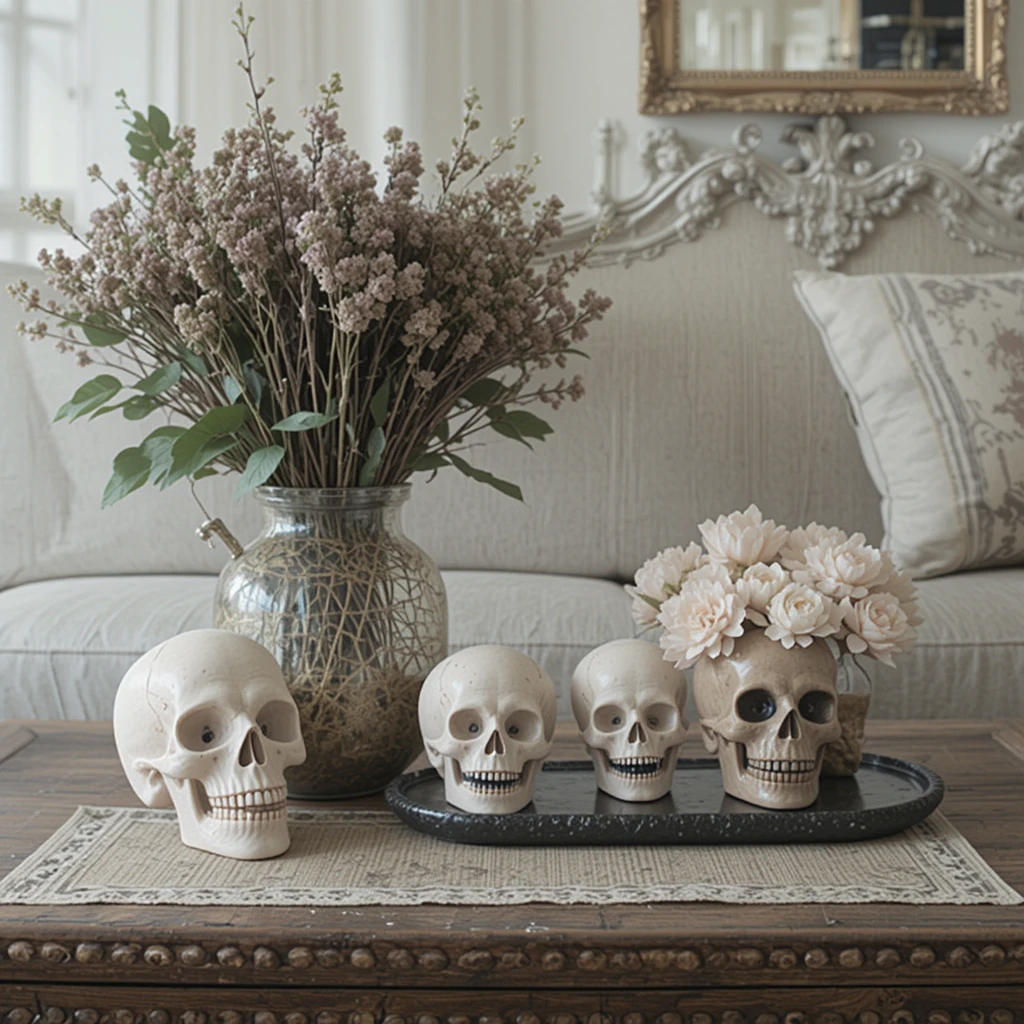 A skull here, a skull there—tastefully done, of course. Think small, ceramic skulls in neutral tones. Place them on shelves or coffee tables.