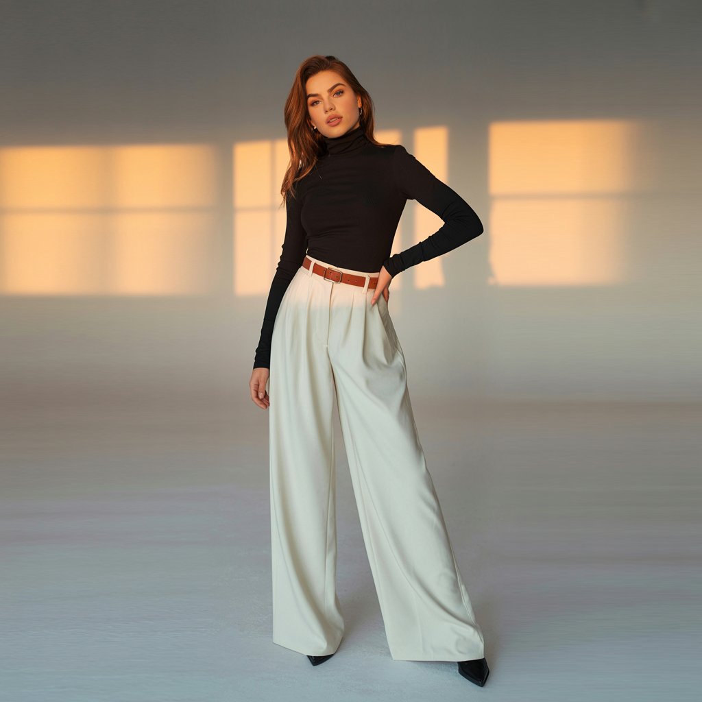 - Wide-Leg Pants – Trendy and elongating.