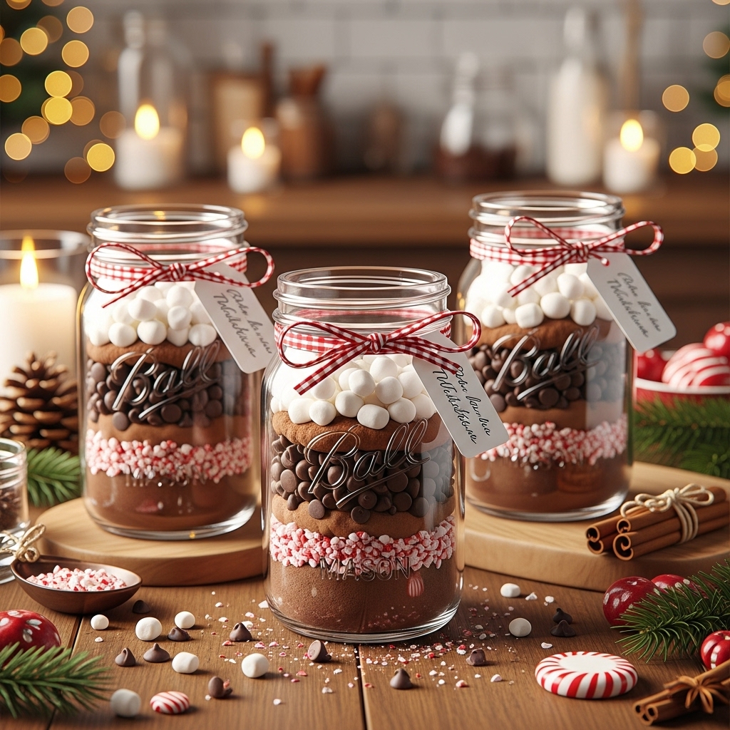 These feel nostalgic and fun, like something you’d spot in a cozy holiday market. Layer cocoa mix, marshmallows, chocolate chips, and maybe even peppermint pieces for extra credit.