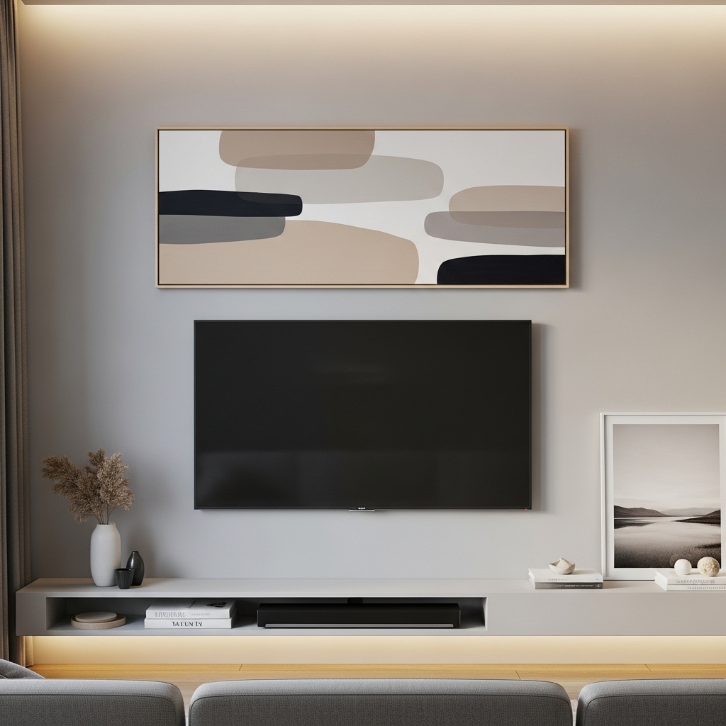 I once hung a narrow vertical piece above my TV. It looked… confused. The TV needs a visual anchor, not a distraction.