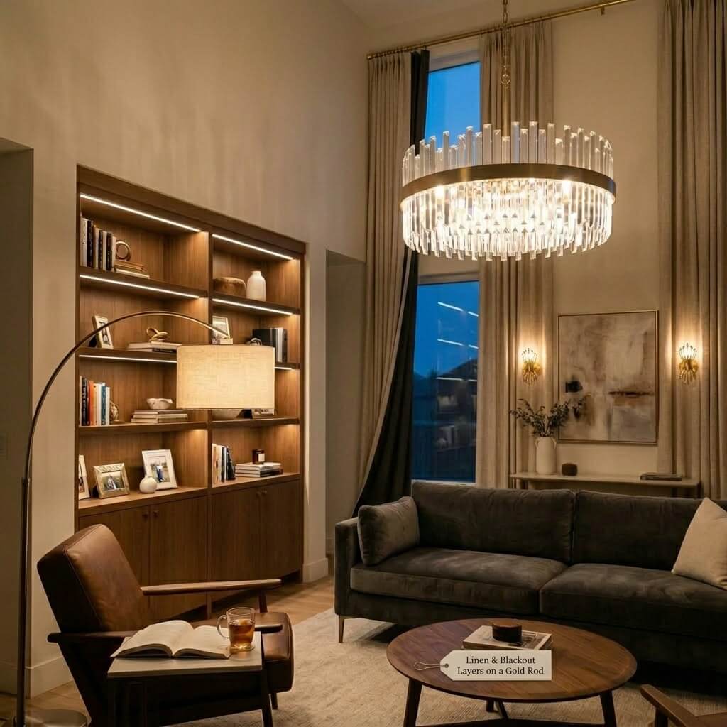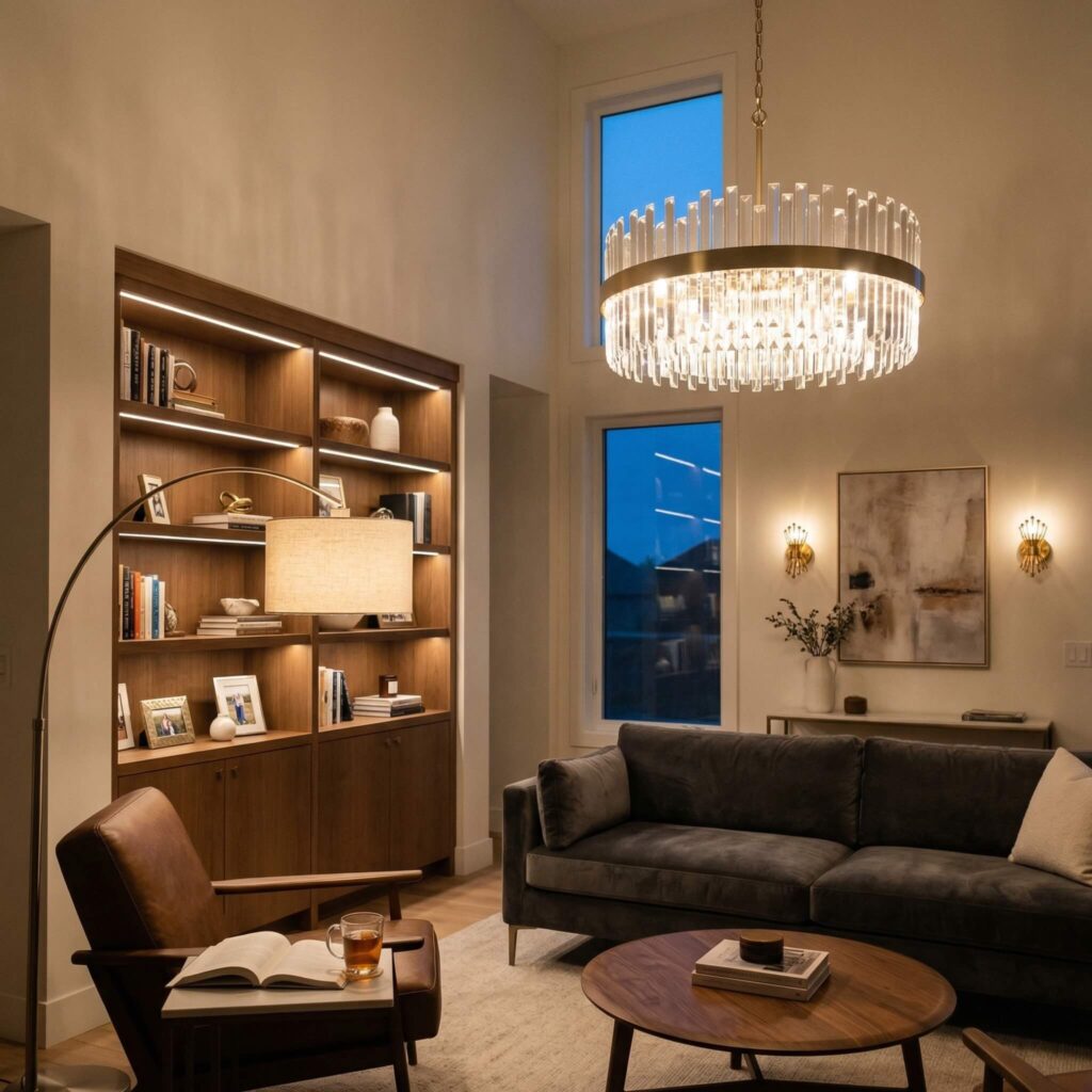 I mix a statement chandelier with warm floor lamps and subtle LED strips behind shelves.