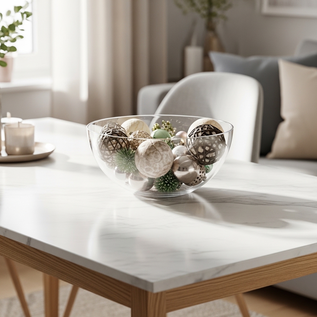 An acrylic bowl keeps things modern and light. I fill mine with decorative spheres or seasonal accents.