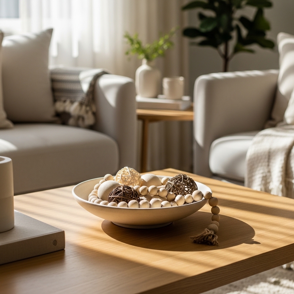 A shallow ceramic bowl with wood beads or decorative balls adds interest without clutter.