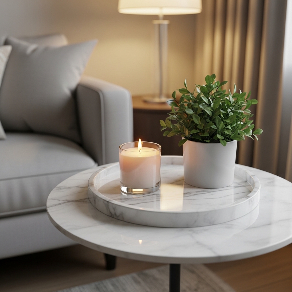 A marble plate acts like a quiet luxury piece on a small table. I place a candle and a tiny plant on mine and let the marble do the talking.