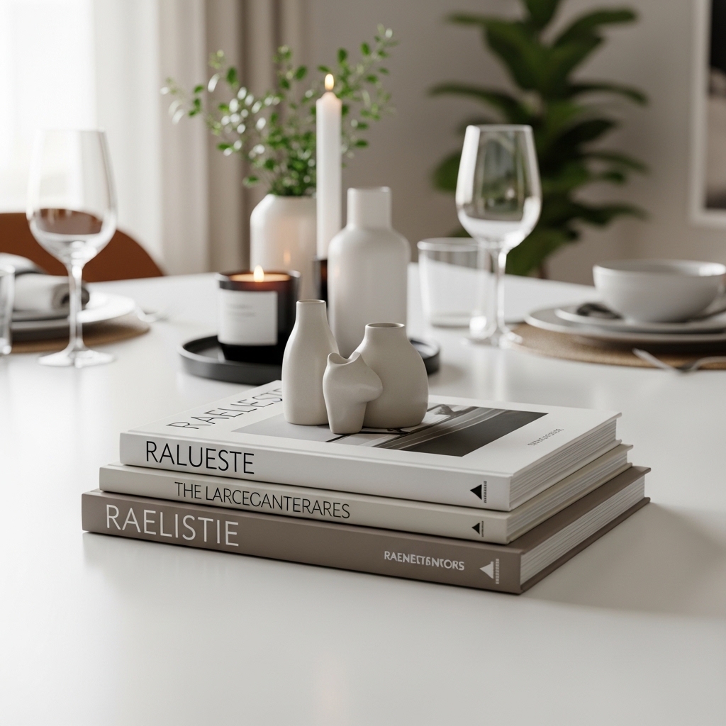 Yes, books work on dining tables too. I stack two or three slim design books and top them with a small object.