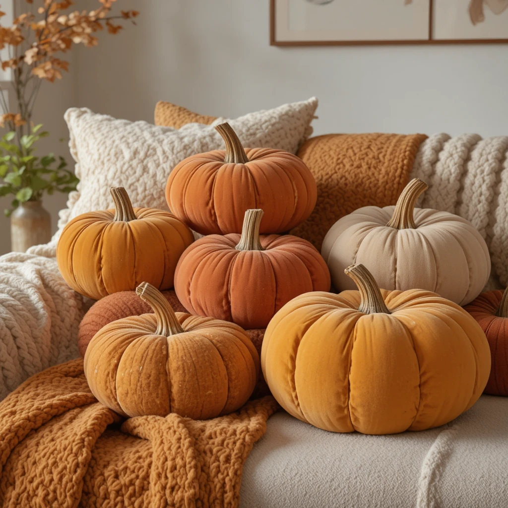- Pillows: Go for soft velvet pumpkin-shaped pillows in warm tones like burnt orange, mustard, and cream. They look super chic piled on a couch or bed.