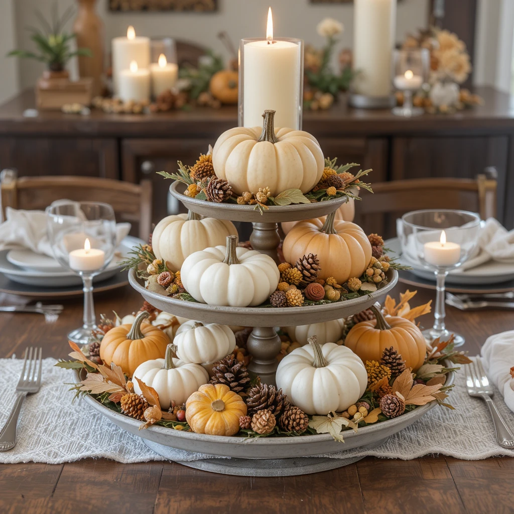 - Tiered Tray: Arrange pumpkins, pinecones, and leaves on a tiered tray for a farmhouse vibe.