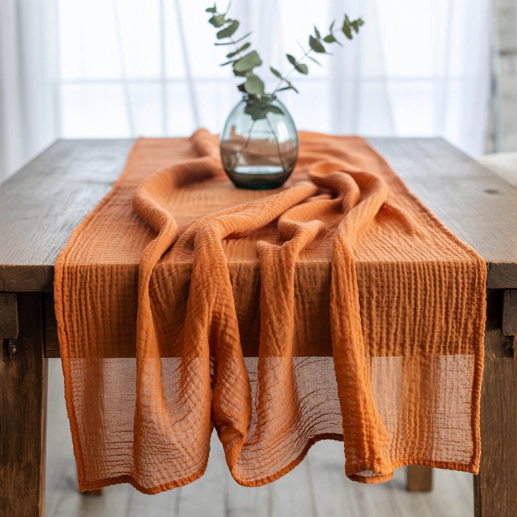 • Burnt Orange Cheesecloth Runner – Warm, textured centerpiece.