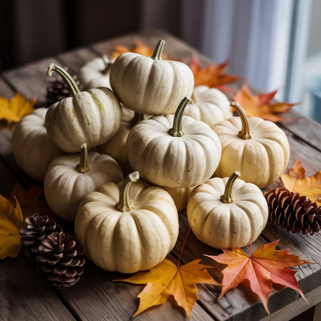 Amazon pick: 17 Pcs White Pumpkins Kit with Maple Leaves and Pine Cones — ready-made mix for easy styling.