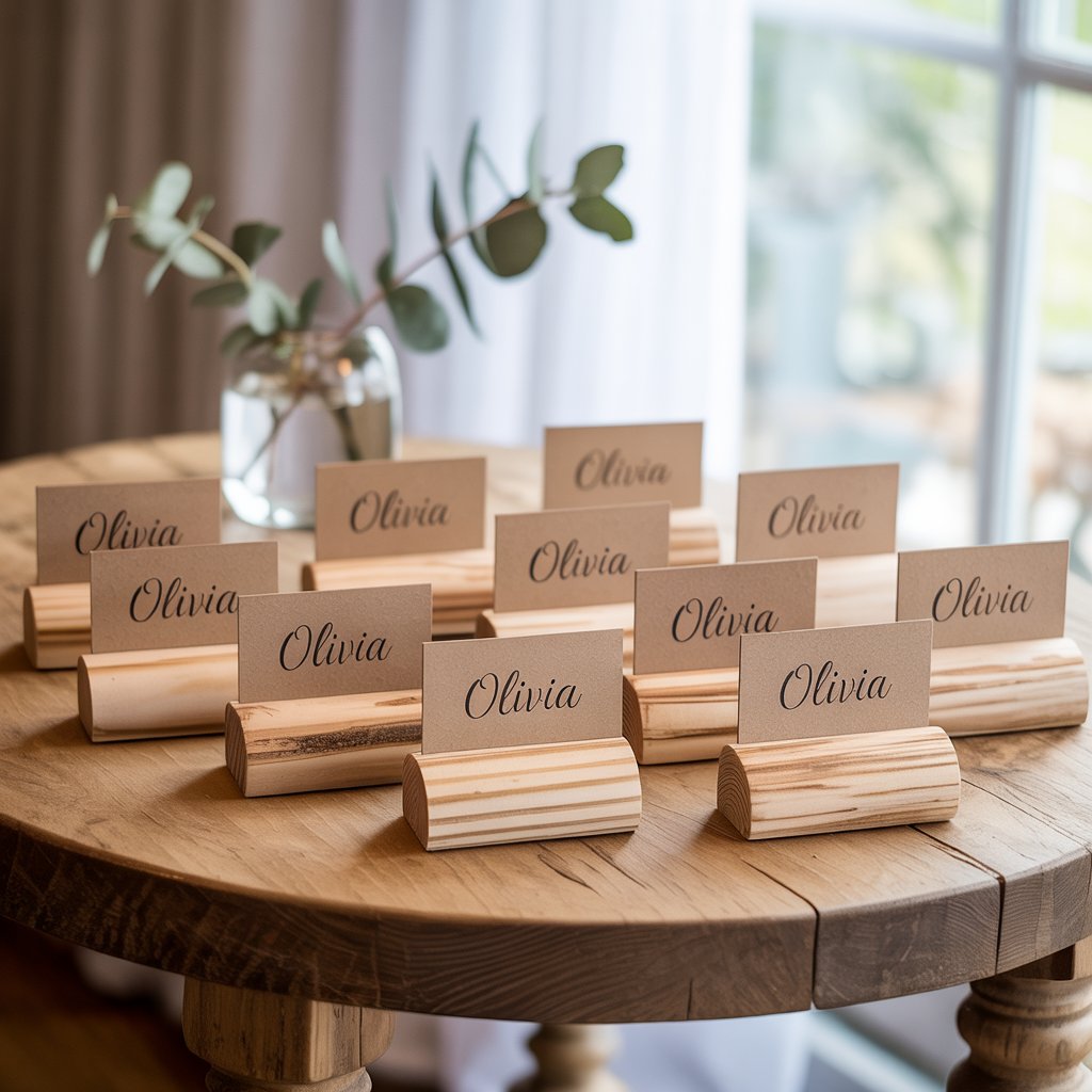 Amazon pick: 10 Pieces Rustic Wood Place Card Holders with Kraft Cards — perfect for labeling seats or dishes.