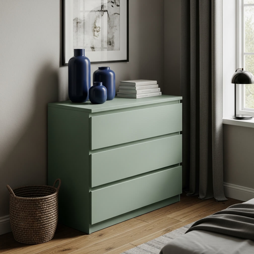 A sage green dresser or nightstand adds softness, while blue vases or books bring contrast. I painted my old dresser sage green, and it looks brand new.