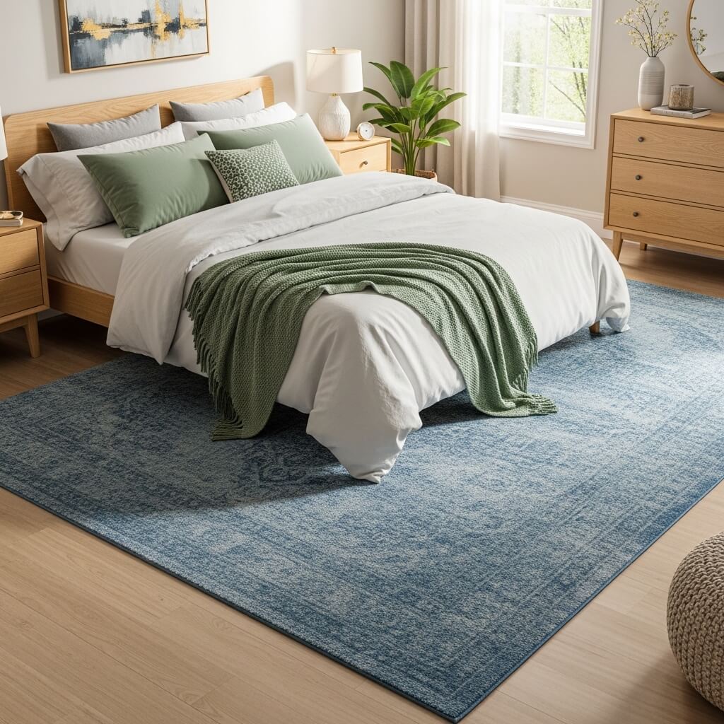 A blue rug anchors your bedroom and makes everything feel intentional. I add sage green pillows and throws on the bed to keep the look balanced.