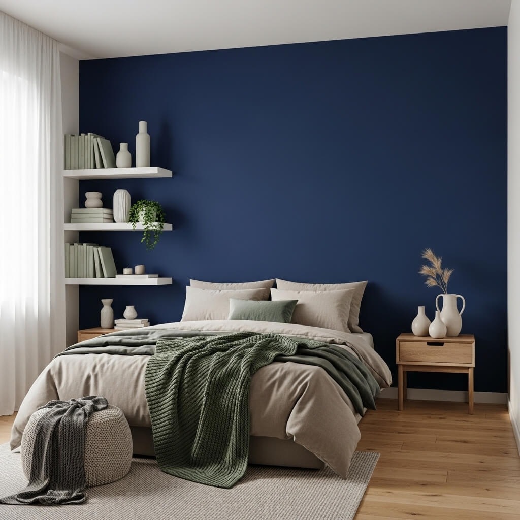 A blue accent wall brings depth, while sage green décor keeps things relaxed. I painted one wall navy and added sage green shelves and pillows, and wow, the room finally had a vibe.